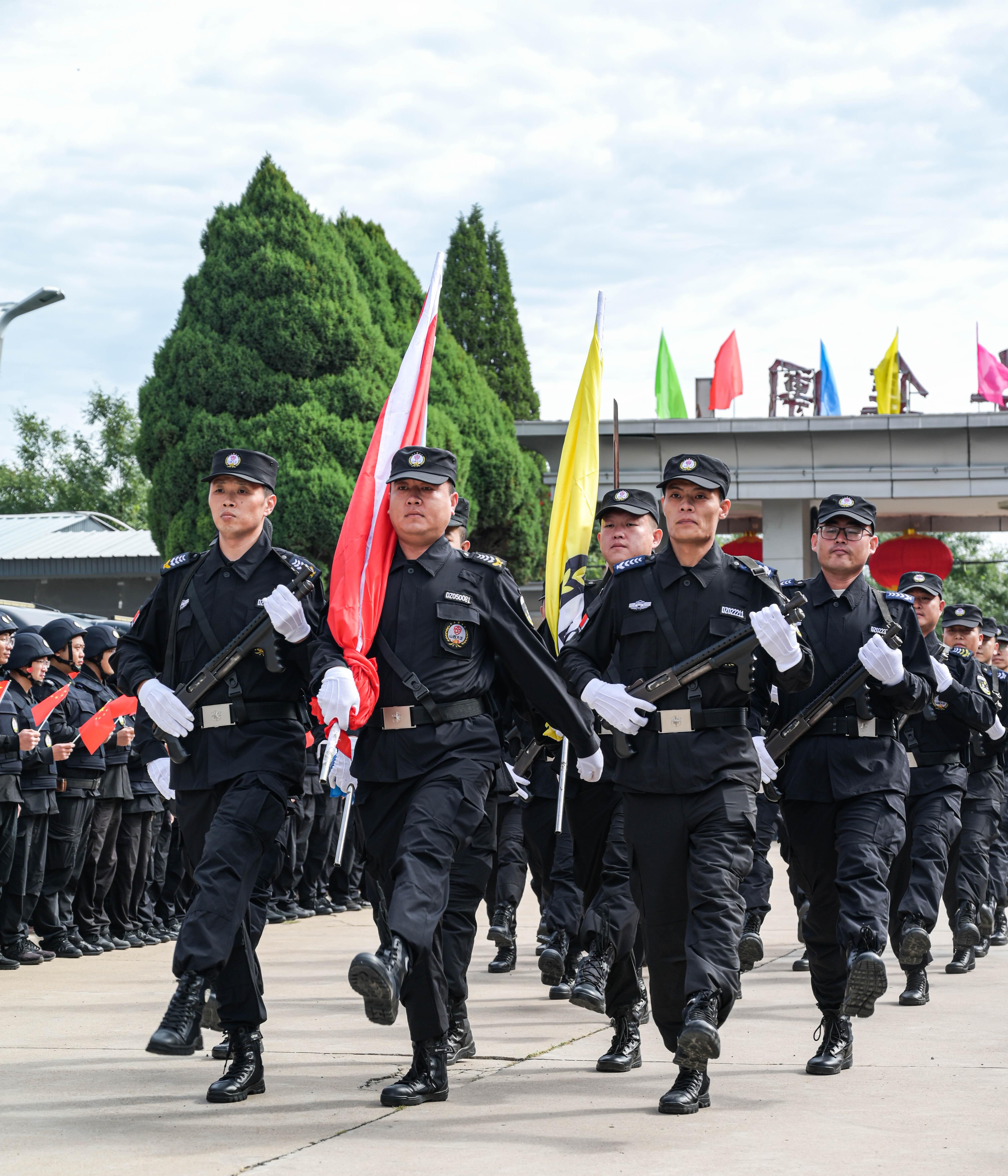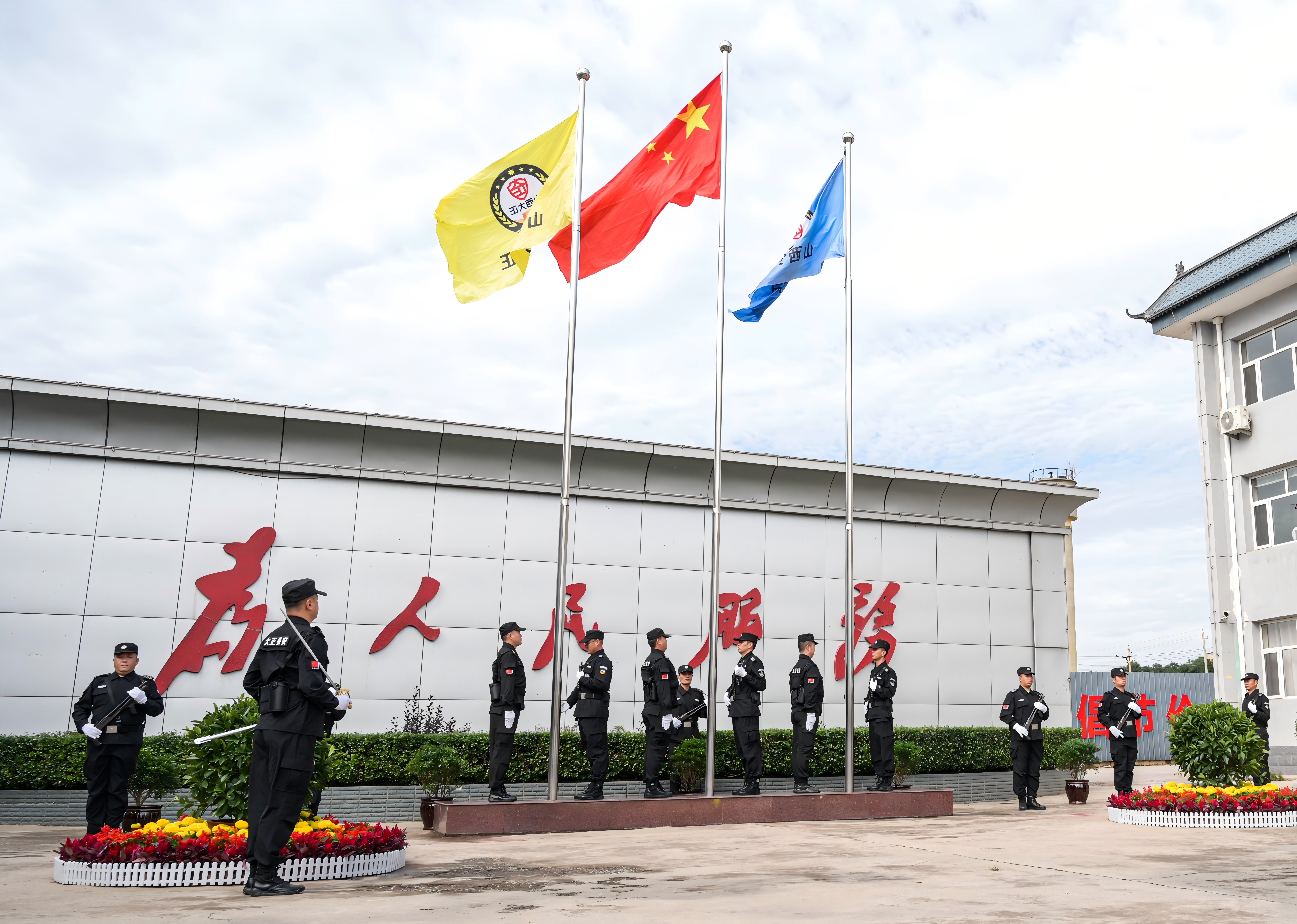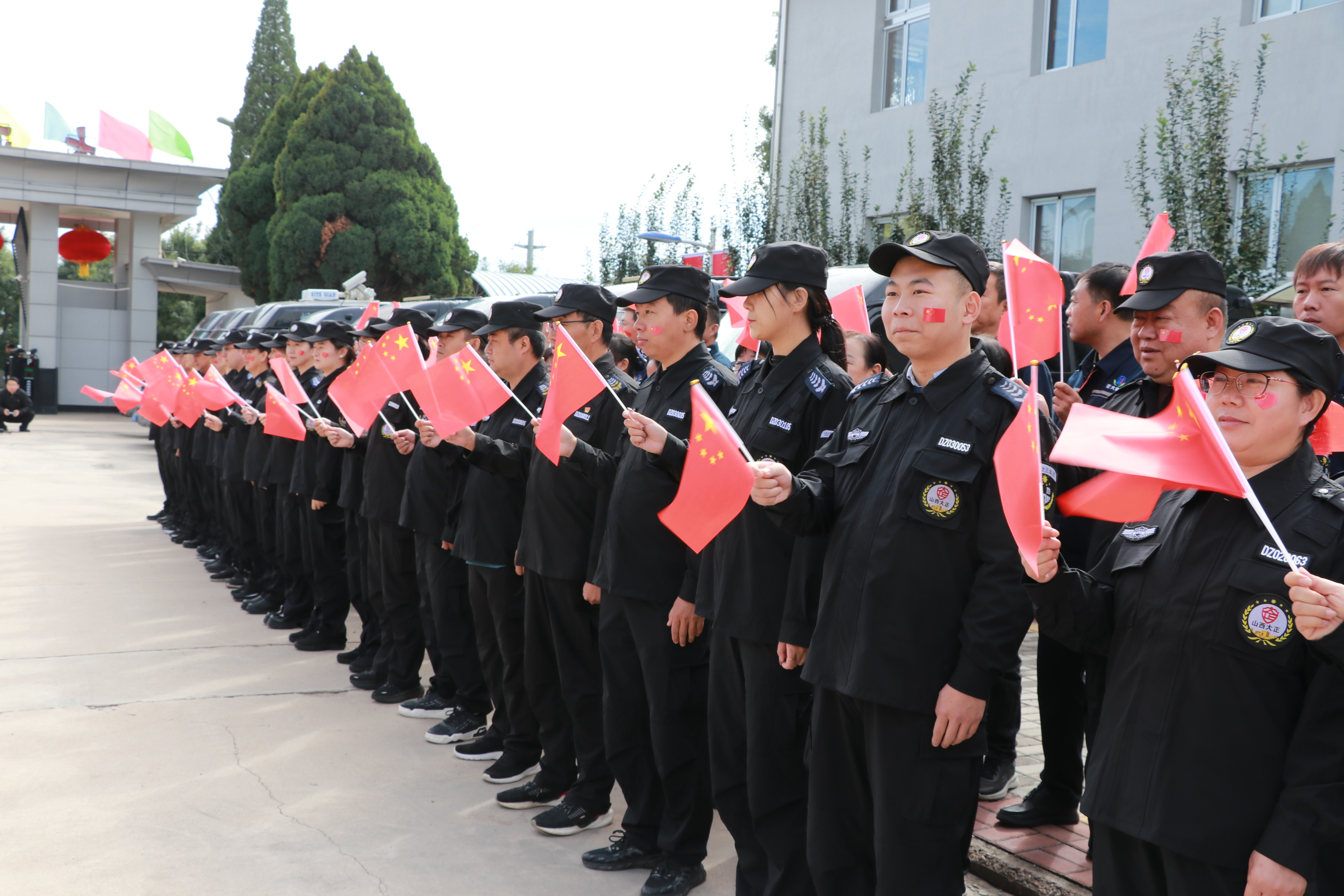 節(jié)日的公司院內(nèi)外,四周花團(tuán)錦簇,大門口燈籠高掛、彩旗飄揚(yáng),為節(jié)日增添了濃厚的喜慶氛圍。公司運(yùn)鈔車、巡邏車、運(yùn)兵車干凈整潔,排列在場地兩側(cè),升旗儀式更顯隆重。9時(shí)30分,集團(tuán)公司、各子公司領(lǐng)導(dǎo)和機(jī)關(guān)各部門、城區(qū)員工共300多人整齊列隊(duì),懷著激動的心情,手持小國旗,臉上貼著愛國貼紙、洋溢幸福的笑容,眼神中充滿了對祖國的熱愛和對升旗儀式的期待。