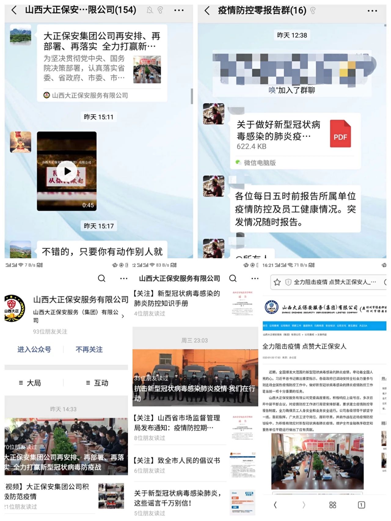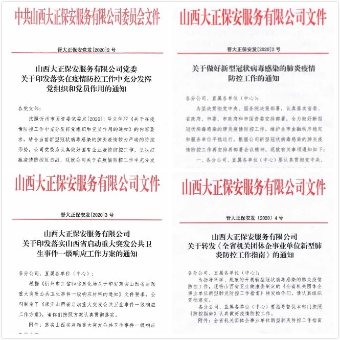 為深入貫徹習(xí)近平總書記對(duì)新型冠狀病毒感染肺炎疫情防控工作的重要指示精神,堅(jiān)決落實(shí)黨中央重大決策部署及省委、市委、市國(guó)資委部署安排,山西大正保安服務(wù)(集團(tuán))有限公司印發(fā)《關(guān)于做好新型冠狀病毒感染的肺炎疫情防控工作的通知》、《山西大正保安服務(wù)有限公司關(guān)于印發(fā)落實(shí)山西省啟動(dòng)重大突發(fā)公共衛(wèi)生事件一級(jí)響應(yīng)工作方案的通知》,要求公司各部門把防控疫情作為當(dāng)前最重要的工作來(lái)抓,落實(shí)落細(xì)防控措施,切實(shí)保障員工安全,保障全市金融秩序穩(wěn)定和服務(wù)單位平穩(wěn)運(yùn)行。集團(tuán)公司黨委印發(fā)了落實(shí)在疫情防控工作中充分發(fā)揮黨組織和黨員作用的通知,要求基層黨支部、全體黨員深刻認(rèn)識(shí)疫情防控形勢(shì),全面落實(shí)我市“五嚴(yán)五防”措施,用實(shí)際行動(dòng)踐行初心使命。