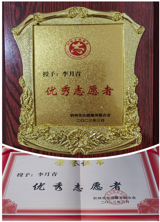 山西大正集團公司李月青榮獲忻州市志愿服務聯(lián)合會2022年度“優(yōu)秀志愿者”榮譽稱號,并作為志愿者團隊代表發(fā)言。