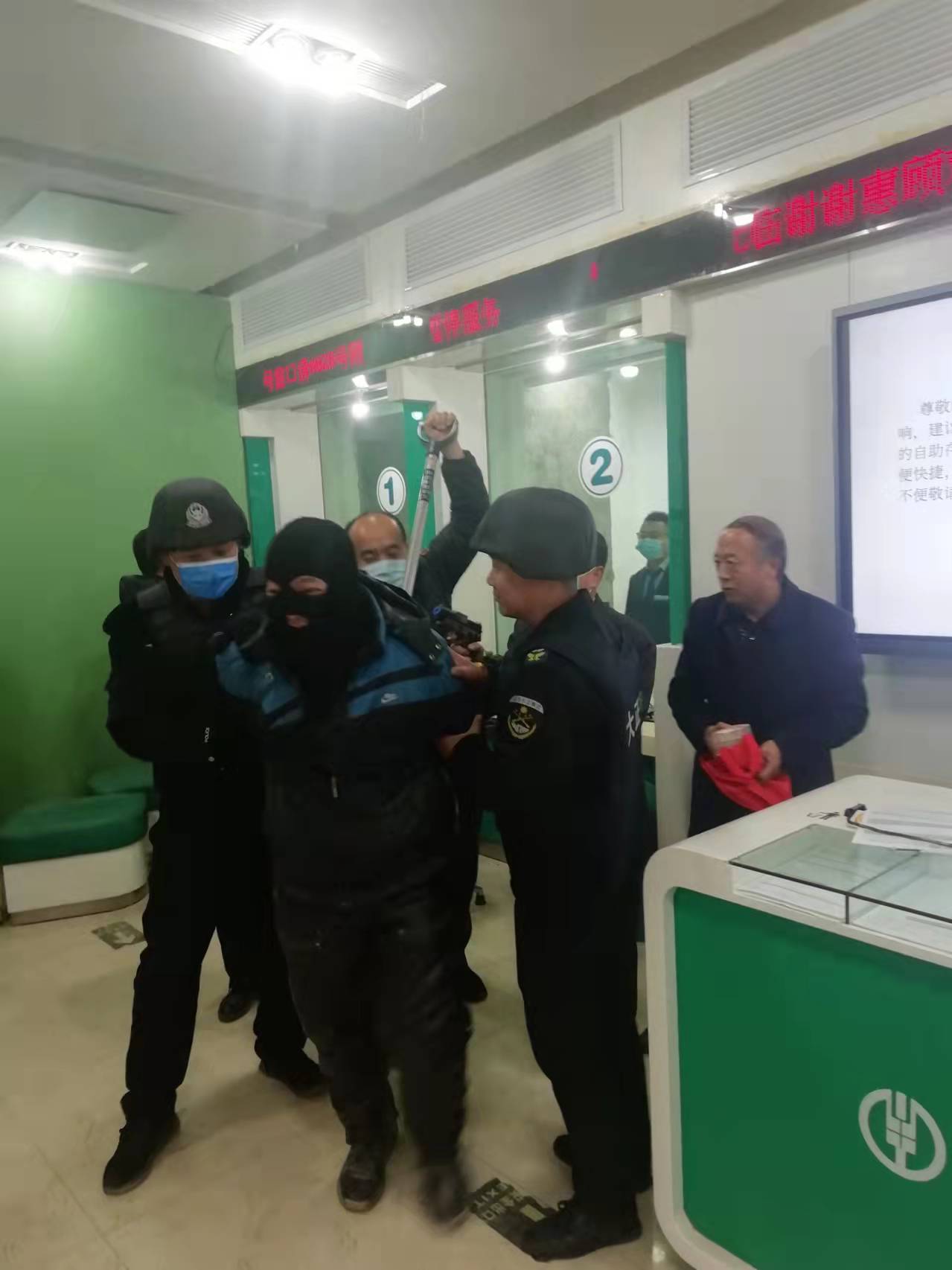 防搶劫演練在農(nóng)行網(wǎng)點按計劃開展,押運人員在“歹徒”搶劫時,臨危不懼,勇敢上前與之搏斗。最終,在大家的共同努力下,制服了“歹徒”。