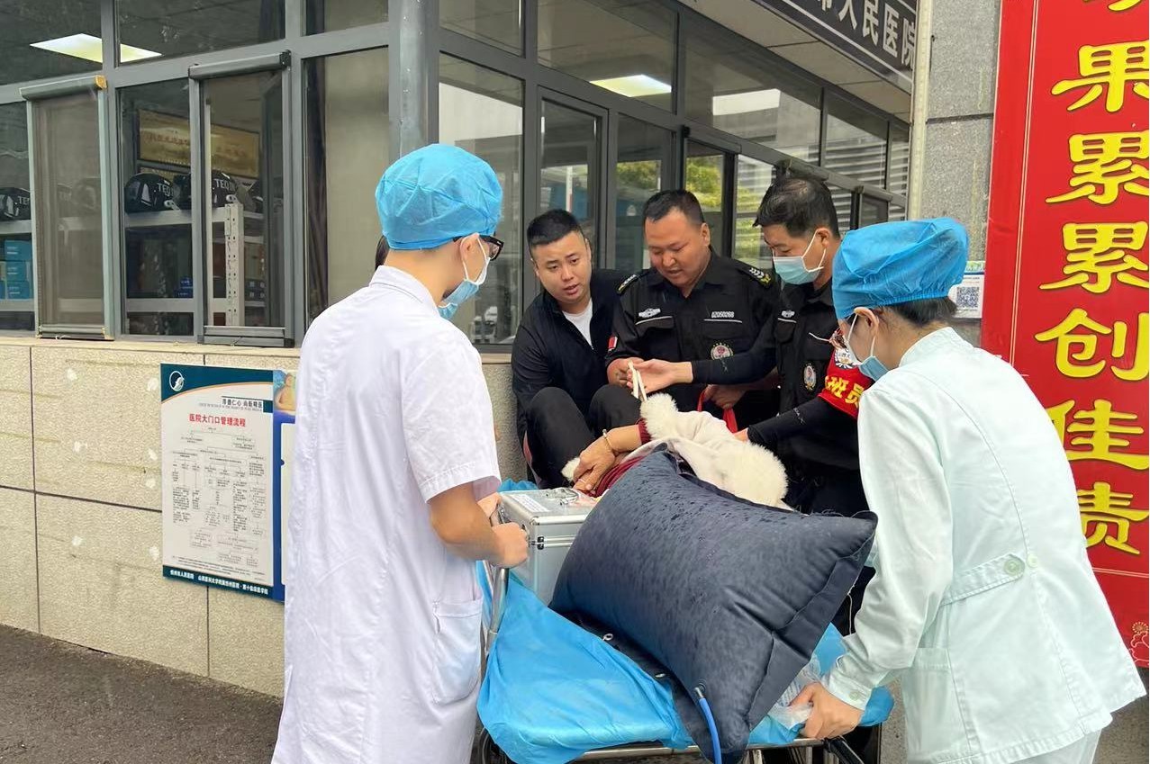 9月19日上午,伴隨著紛紛細(xì)雨,保安直屬公司市醫(yī)院駐勤中隊和往常一樣繁忙的一天開始了。9時許,西門人行通道正常查驗場所碼過程中,一名中老年婦女只身一人手拎兩個包步履蹣跚顫顫巍巍走上前來,正在執(zhí)勤的兩名女隊員發(fā)現(xiàn)后急忙上前攙扶詢問是否需要幫助,話語間,老婦手里的包突然掉落地上,癱倒在女隊員身邊。在隊長得知消息后,協(xié)同兩名男隊員即刻前往急診中心尋求醫(yī)生和擔(dān)架,待醫(yī)生到達(dá)過程中,老婦一直嘴上喊心口疼,并且頭昏,不時有嘔吐癥狀,一邊嘴上哭訴子女無人陪伴就醫(yī),兩名女隊員則在其身旁細(xì)心安撫情緒,告知醫(yī)生和擔(dān)架馬上過來。幾分鐘內(nèi)兩名男隊員和兩名醫(yī)生推著擔(dān)架車一路飛奔急忙趕來,醫(yī)生詢問后,兩名男隊員將婦女抬上擔(dān)架車,送至急診搶救。