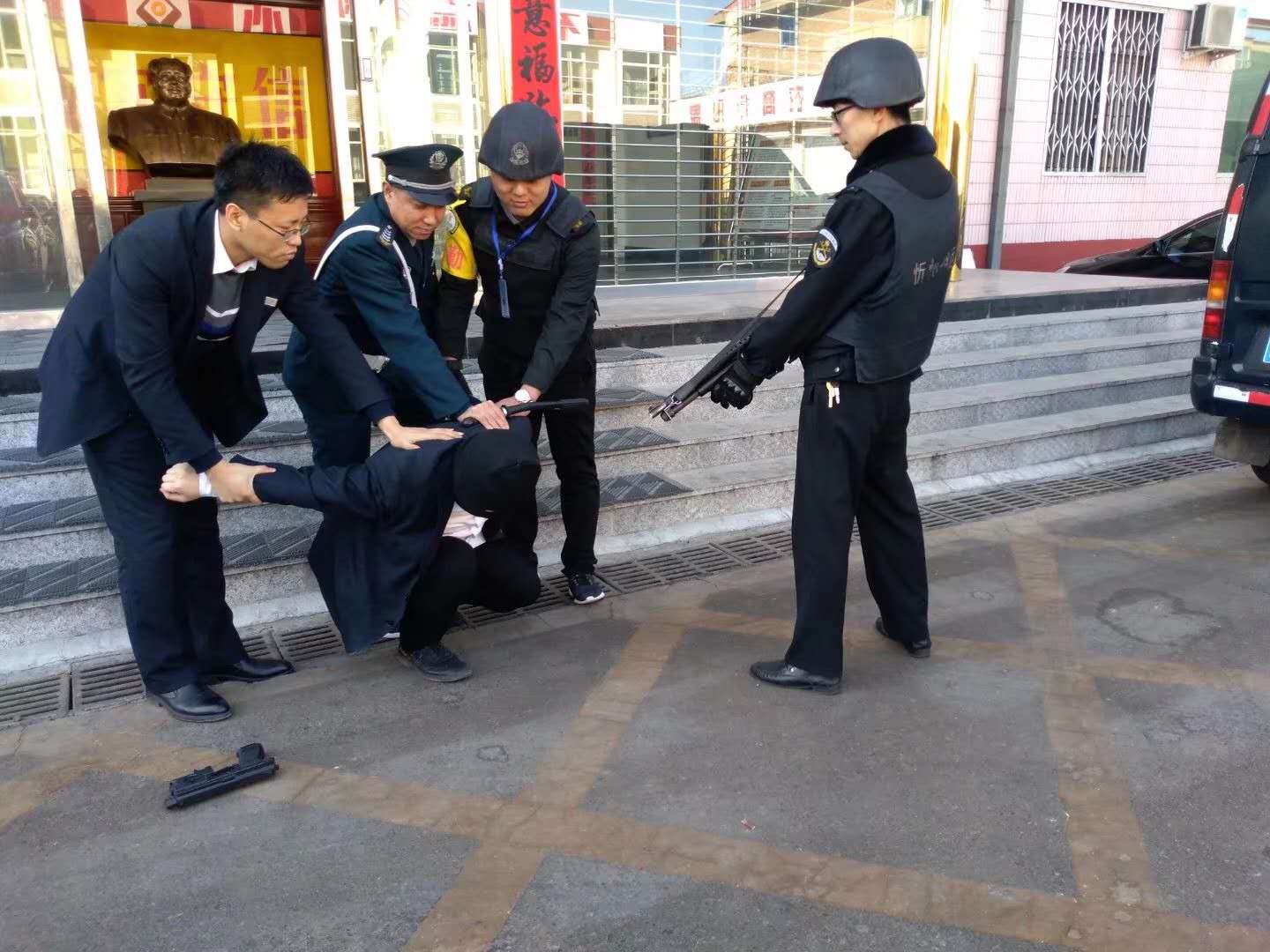 3月16日上午,守押繁峙中隊聯(lián)合農(nóng)商行組織隊員進(jìn)行了一次反搶預(yù)案演練。演練內(nèi)容為運鈔車抵達(dá)網(wǎng)點后裝卸款箱時遭遇持械歹徒搶劫。整個演練過程,隊員準(zhǔn)備充分、緊張有序、反應(yīng)迅速、分工明確,拎包員迅速鎖閉金庫門,司機(jī)立即報警,押運員口頭警告無效后鳴槍示警,最終合力制服歹徒。
